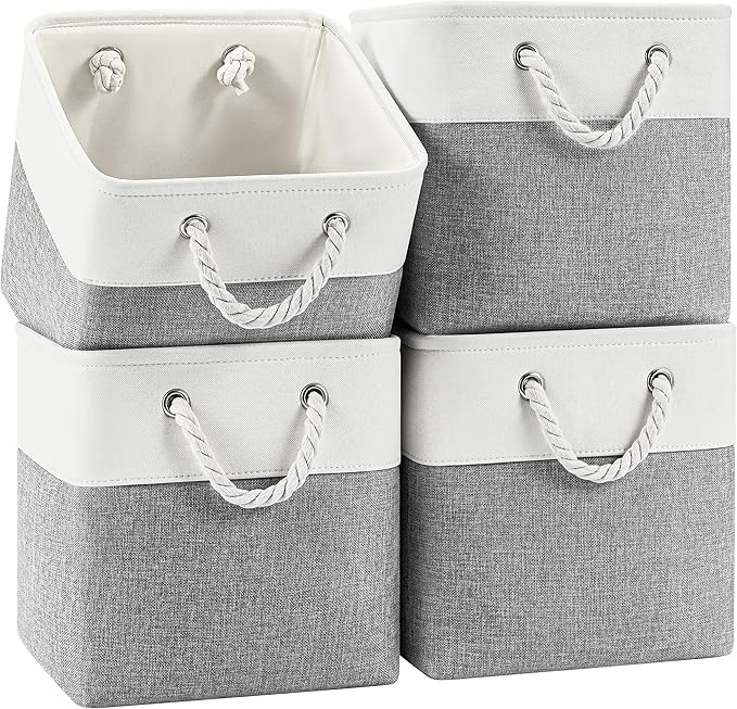 11 Inch Storage Cubes 4-Pack, Foldable Fabric Organizer Bins with Rope Handles, Cube Storage Baskets for Closet Shelves and Home Organization(White/Gray)