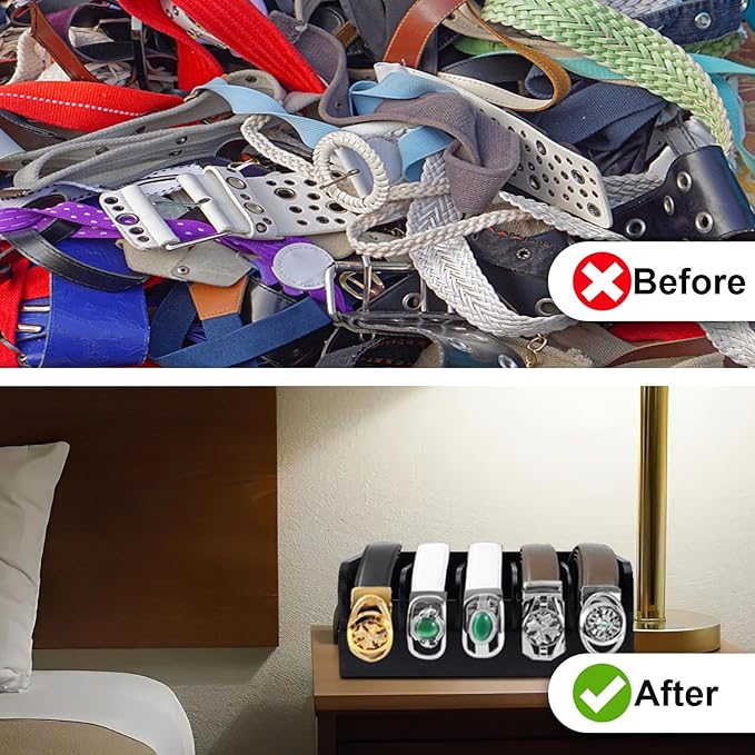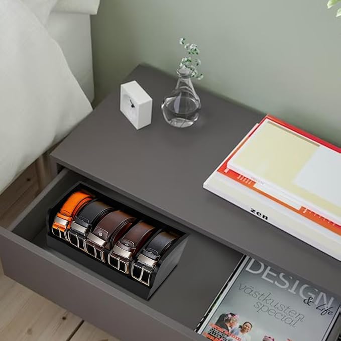 - Suits Most Belts:The 5 compartments belt storage organizer is about 11.57 x 6.5 x 4.5 inches, each 2.2 inches apart, and can hold most of the belts. It is convenient for you to put in and out.