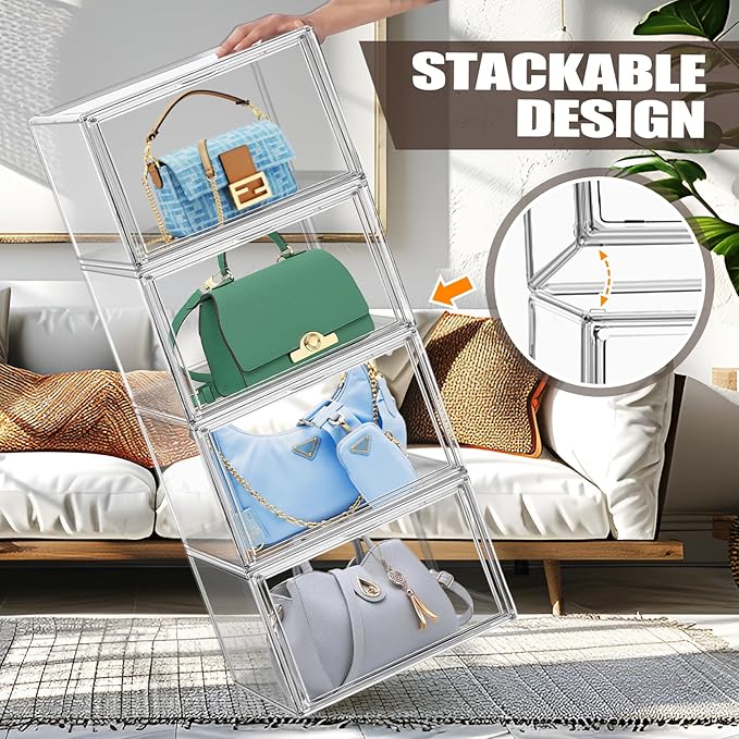 - DIY Collection Wall: These stackable transparent storage organizer boxes are perfect for showcasing your sneaker or Handbag while keeping them tidy and secure. Ideal for stacking without toppling over, they save room space and maintain a neat appearance. Illuminate your collection room with cool lighting for a show-stopping effect
