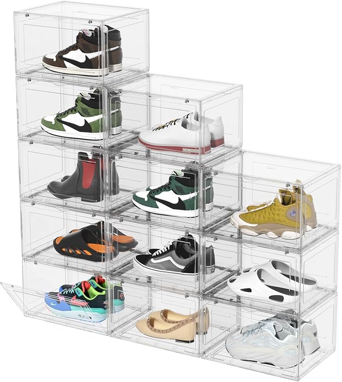 12 Packs Large Plastic Clear Shoe Boxes with Magnetic Door, Acrylic Display Case, Stackable Shoe Storage Organizer Container for Boot Sneaker