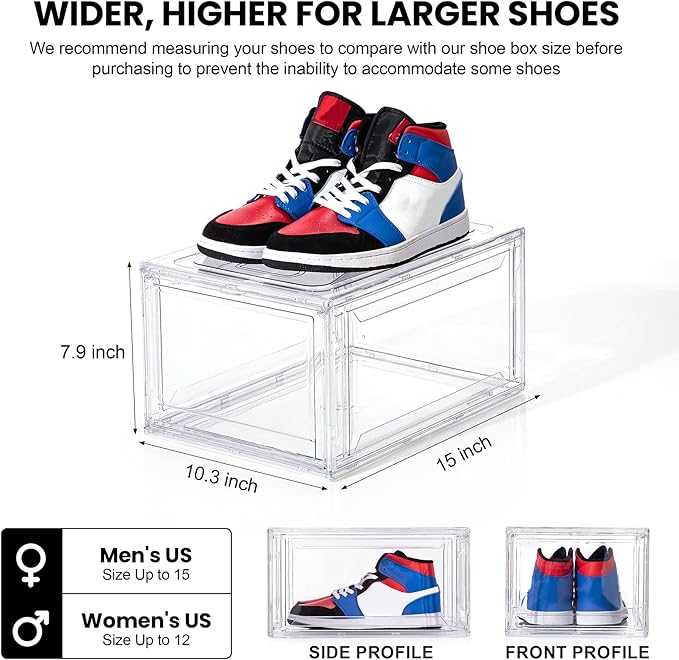 - 【Professional Grade Shoe Display Case】Our sneaker storage box is made of heavy duty material PET and acrylic.Strong and durable,Which can accommodate AJ, sneakers, Canvas, high-top shoes, heels, even boots, and other larger sizes.Each shoe box is 15”(L) x 10.3”(W) x7.9”(H),and can fit up to US size 15 shoes.