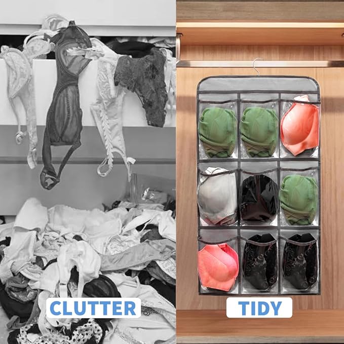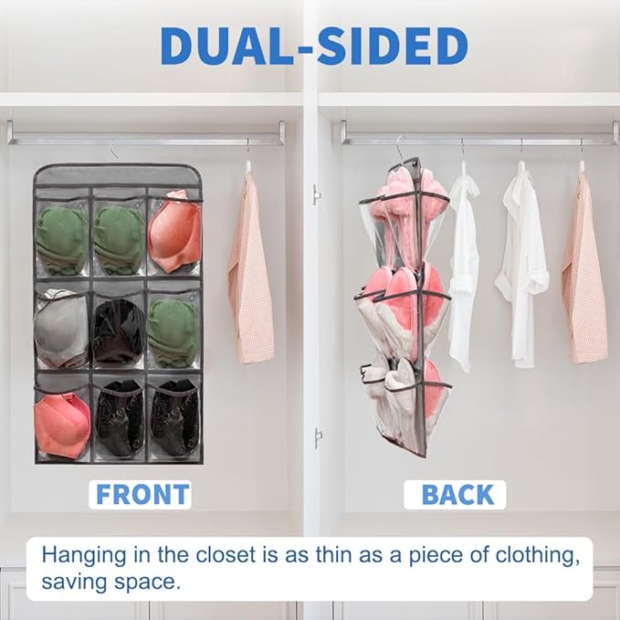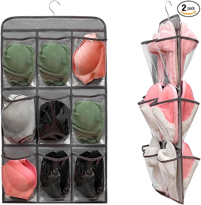 2 Pcs Closet Organizer Dual Sided Hanging Shoe Storage Bag Underwear Socks Holder with 18 Pockets (CLEAR POCKETS)