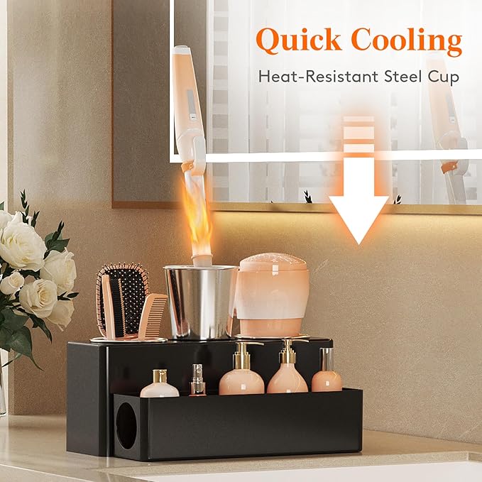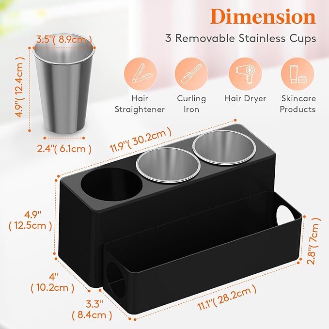 - Heat-Resistant Tool Rack: This blow dryer holder features three heat-resistant stainless steel cups, serving as stands for hair dryer and curling iron to cool down quickly. With a deep design, the cups provide stability and prevent tipping
