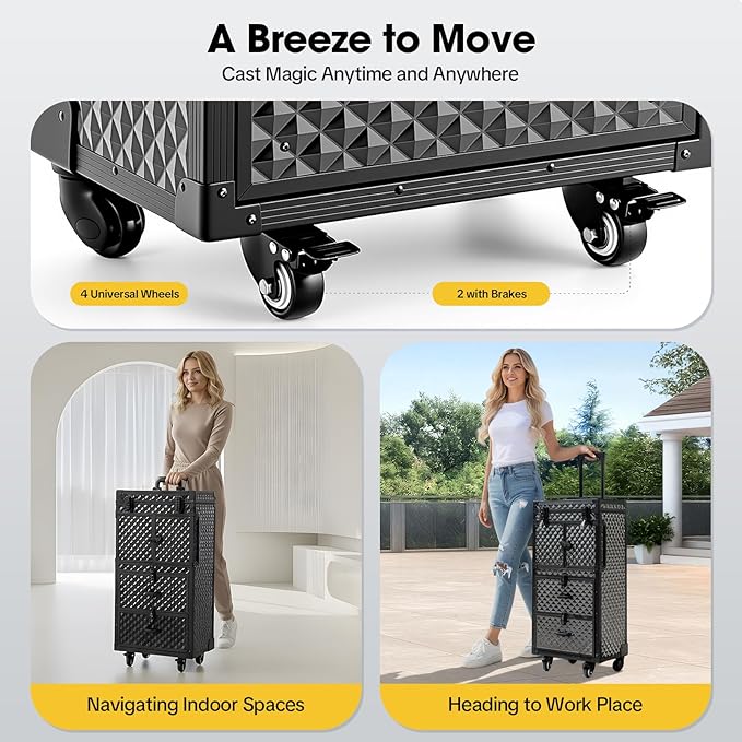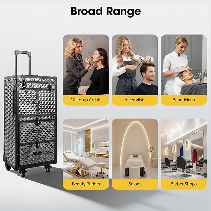 - Scope of Application:The cosmetology case on wheels is suitable for professional make-up artists, hairstylists, nail artists, beauticians, and semi-permanent makeup artists in beauty parlors, salons, private homes, parties, weddings, and other occasions.Package Included:1* Rolling Makeup Case;2* Combination Locks;6* Keys