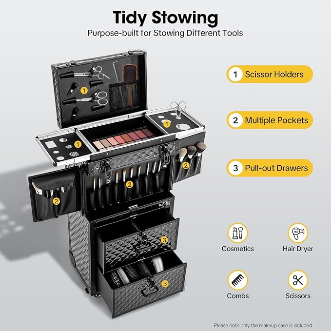- Organized Storage:The rolling makeup case comes with a multi-layer large capacity with multiple pockets, scissors buckles, and 2 drawers, and each layer is built for storing different tools. You can use it to store your cosmetics, hair dryer, barber tools, combs, scissors, and so on, keeping your tools more organized.
