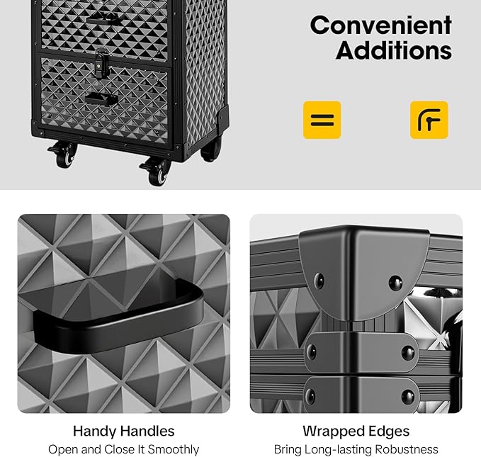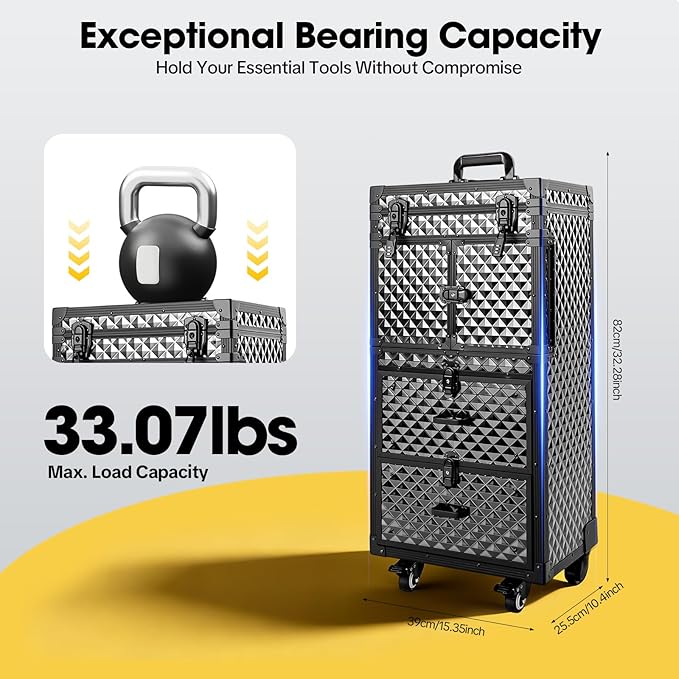 - Quality Materials:This makeup train case is made of high-quality aluminum, ABS, and iron, which has resistance to rust and wear, and is not easy to fade. And it can bear a weight of up to 33.07 lbs and you can use it confidently to hold enough tools.