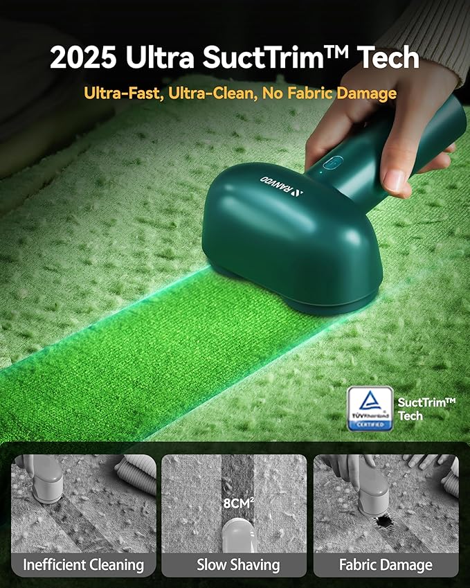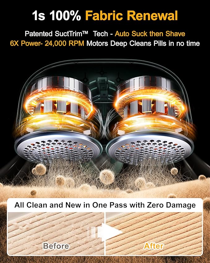 - [Experience 100% Fabric Renewal with Zero Damage]: Say Goodbye to Slow Single-Head Shavers & Scratched Garments, patented SuctTrim tech auto suctions first and then shaves, ensuring strong suction and complete shaving. It leaves no lint residue behind. With a dual-core speed shaving 6X high-speed motor running at 24,000 RPM, RANVOO gogo lints offers the strongest power on the market. No need to repeatedly go over the same spot, as it gets the job done in one go, without causing any damage to your clothes.
