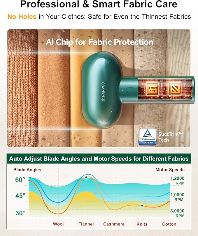 - [Ideal for Delicate Woolens -Pro-Level Fabric Care] Safety Tripled & Fabrics Secured, a must-have for High-End Dry Cleaners. Equipped with a built-in intelligent identification chip, RANVOO fabric shaver automatically adjusts the motor power and trimming angle according to different fabric types, providing optimal protection. The external titanium-plated 0.35mm thickened blade net always maintains a safe distance, ensuring that only the shaving ball touches the clothes without causing any damage. With its anti-static Nano-coating and smooth panel, it offers an additional layer of protection for your valuable garments.