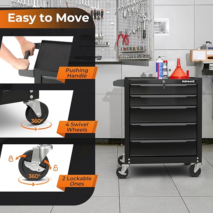 IRONMAX 5-Drawer Tool Chest with Wheels, Rolling Tool Storage Organizer Toolbox with Locking System & Liner, Metal Tool Cabinet for Warehouse, Garage, Workshop, Household