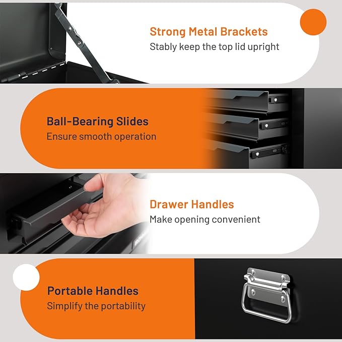 - Durable and Sturdy Materials: The tool chest is made of thickened cold-rolled steel and has a sturdy and stable construction. And the surface is coated with a high-quality powder, which gives the toolbox an elegant black appearance and enhances its durability, prevents rust, and has a long service life.