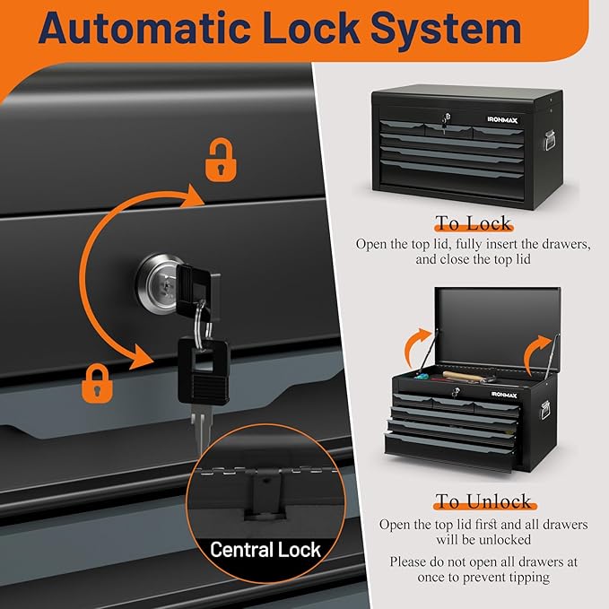 - Secure Locking Mechanism: Our tool box comes with 2 keys that lock to prevent items from getting lost. And the tool organizer has a locking mechanism, the lock bar can keep all drawers closed when the lid is closed. Tip: All drawers are lockable, make sure the drawers are fully pushed in and the lid is closed. Instead, open the lid to unlock the mechanism.