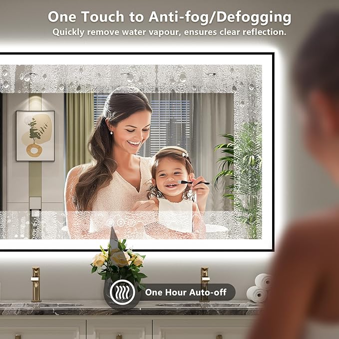- 🔥【Anti-Fog/Defog, Clear Reflection】- Still troubled by the fog on the mirror after shower? This anti-fog lighted mirror can free you from this trouble. Turn on the defogger can quickly remove water vapor, always maintain a clear reflection. It will auto turn off after an hour. Long press the "Anti-fog" button can turn off the blue light of 3 buttons.