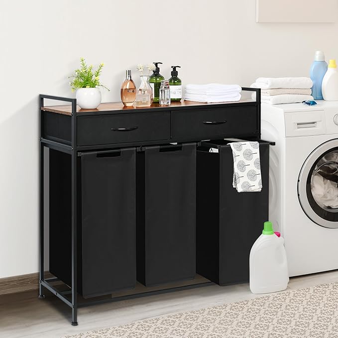 Laundry Sorter 3 Section, 180L Laundry Hamper Basket with Shelf and 2 Drawers, 3 Compartment Clothes Storage Organizer Cart, Pull-Out Removable Oxford Fabric Bags, Black