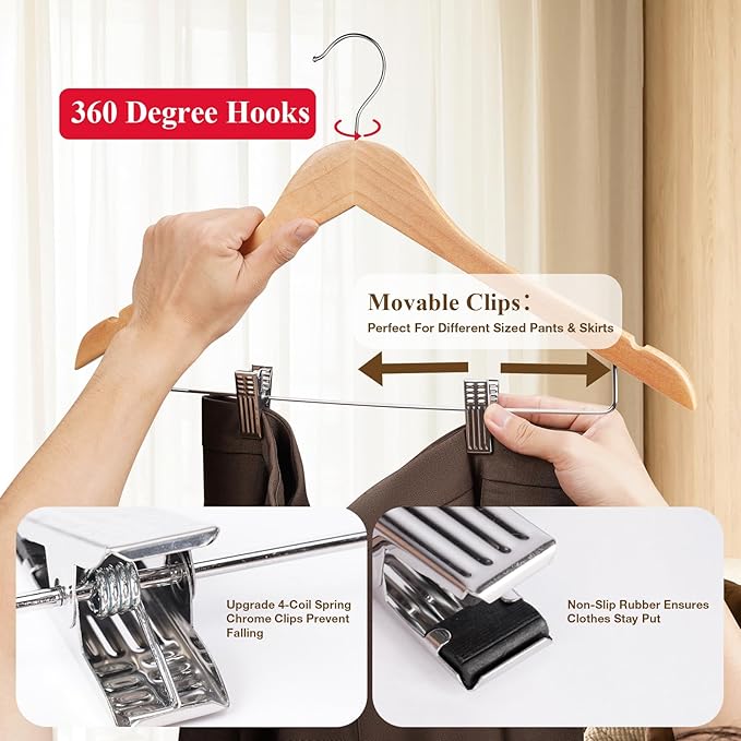 - 【2 In 1 For Suit Set】These hangers with clips are perfect for hanging pants, skirts, jeans and shorts.The shoulder contours of the wooden hanger mimic human shoulders,keeping your suit in nice shape.2 Piece Outfits on 1 hanger makes matching clothes more easily and create more space for your closet.