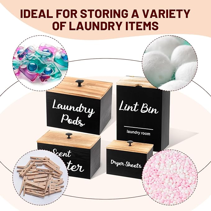 - Quality and Reliable Material: our laundry pod and dryer sheet container, scent booster dispenser and magnetic lint bin with lid are made of pine wood, solid and reliable, adding a rustic touch to your laundry room; The back of the lint bin has a magnet that can be attached to the side of the washing machine to prevent it from slipping off, can be applied for a long time