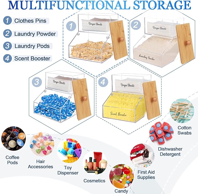 - 2-IN-1 DRYER SHEET HOLDER: This laundry pods container & dryer sheet dispenser adopts a two-layer design, dryer sheets can be placed on the top and laundry balls can be placed on the bottom. You can also place your laundry items according to your preferences