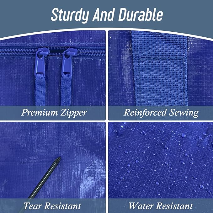 12 Pack Extra Heavy Duty Large Moving Bags with Strong Zipper & Comfortable Handles, Sturdy & Durable Clothes Storage Bags Totes Bins, Packing Moving Boxes for College Supplies, Blue