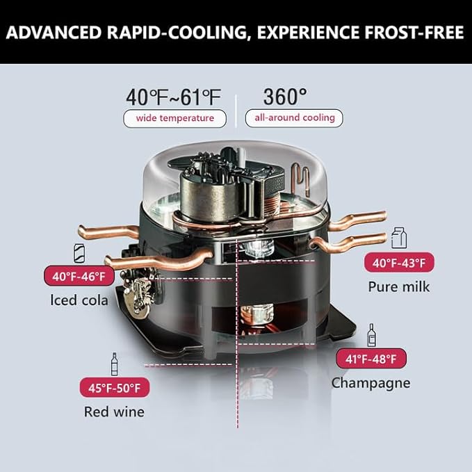 - Rapid Air Cooling Technology: Equipped with an energy-efficient compressor, this beverage fridge quickly circulates cold air throughout the unit. Operating at a quiet level below 38 dB, it ensures a peaceful environment. The double-layered door effectively blocks UV rays, while superior sealing maintains a consistent internal temperature