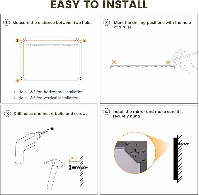 - 【Easy Hanging Option】4 mounting holes allow horizontal & vertical hanging, suitable for any space. The rectangle bathroom mirror comes with 3 expansion screws, nails and 1 glove, easy to hang safely and meet all your installation needs;