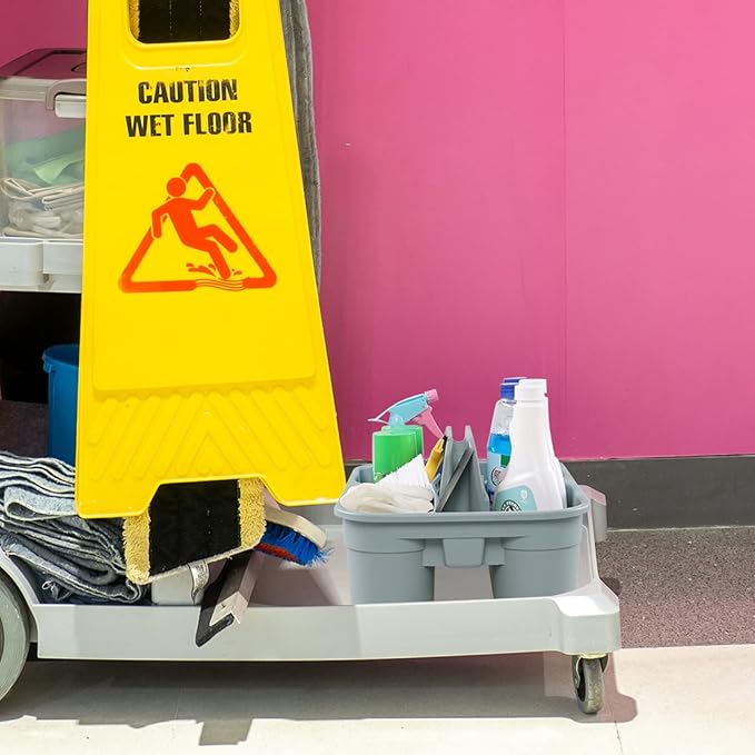 - The caddy is divided into two compartments and can be installed on most cleaning cleaning cart