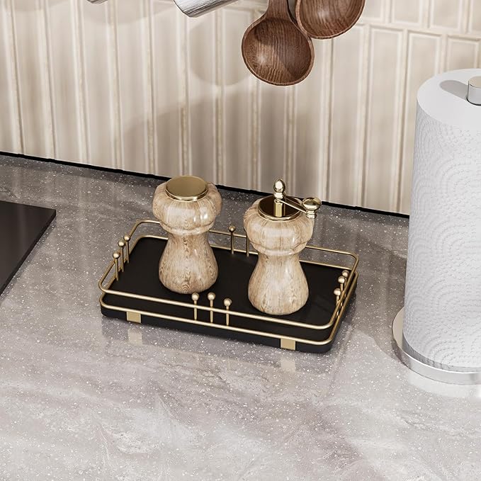 Bathroom Vanity Tray for Toiletries Makeup Perfume Candle Toilet Tank, Kitchen Tray for Soap Dispenser Spice Salt, Small Tray for Countertop Decor Coffee Nightstand 7.9”x4.4” Black-Gold