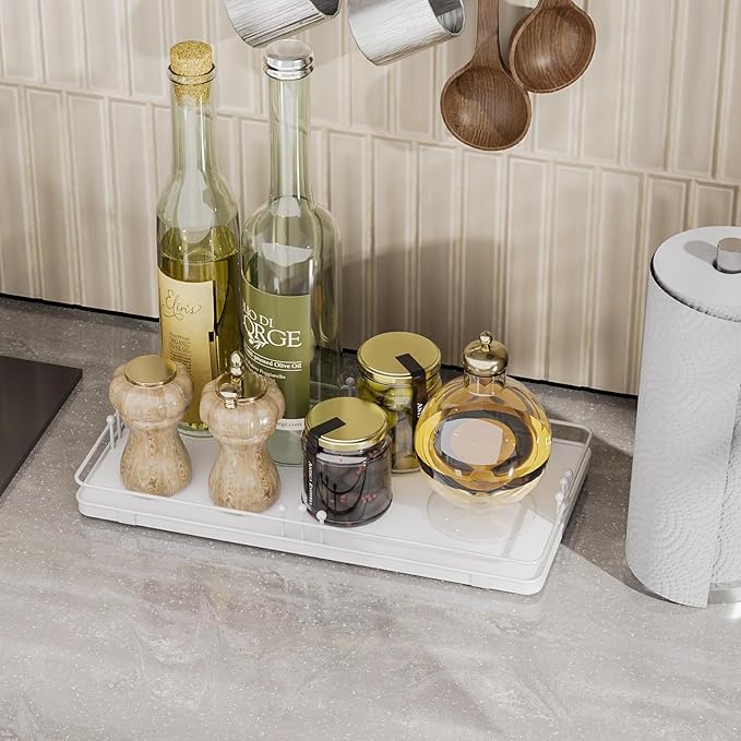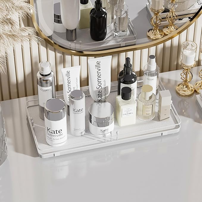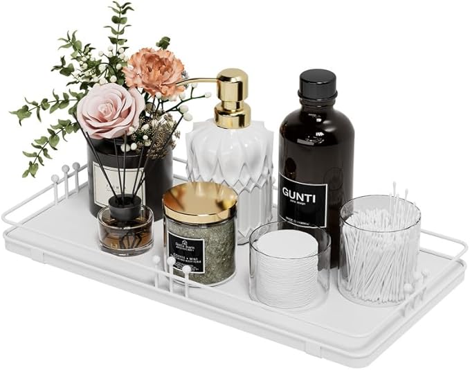 - Versatile & Functional: Our bathroom basket enhances any space with its stylish design while serving multiple purposes throughout your home; Whether you use it as a bathroom tray, vanity tray, kitchen tray, decorative tray, perfume tray, jewelry tray, serving tray, catch-all tray, key tray, or toilet tank tray, it will keep your countertops tidy while adding a unique and stylish touch to any room