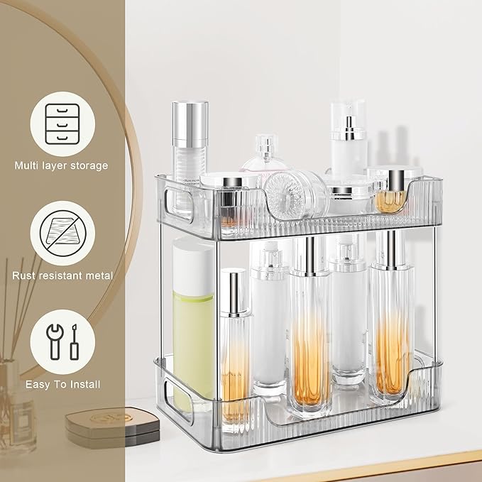 - 【Large capacity Size】2 tier bathroom countertop organizer is 11*6.5*10.04 inch.Large capacity, perfect size, enough height, 8.07 inches of layer spacing can be placed higher items.Vanity Organizers And Storage Can Hold Skincare,Makeup,Beauty Tools And Other Related Items
