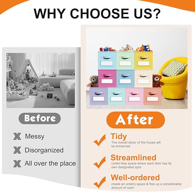 - Macaron Color: you will get 10 PCS macaron colorful fabric cube storage organizers with label cards, they are 10½" L x 10½" W x 11" H, the proper size will fit in your cabinets, and blend in with room decor while keeping items orderly
