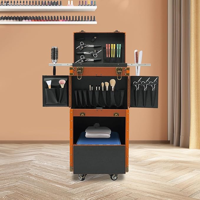 - Generous Appearance: The coffee color tone, rectangular shape, and smooth lines give this large storage cosmetic trolley a generous appearance, which is a great decoration for your hair salon. In addition, Its exquisite design and large capacity make this large storage cosmetic trolley a great gift to your mother, girlfriend, sisters, wife, and loved ones so that they can enjoy more convenient makeup time.