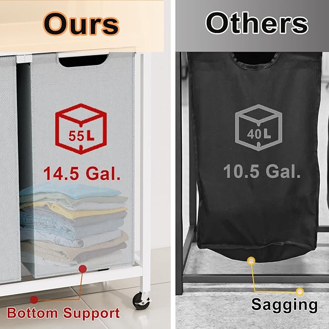 - Large Capacity - This laundry hamper has 2 laundry bags, each with a capacity of 14.5 gallons (55 L), providing enough space to accommodate a family's dirty clothes. It allows you to sort clothing by different types, making laundry sorting effortless