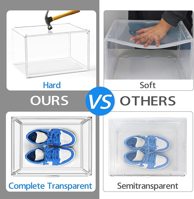 - Large Capacity:The clear shoe boxes with large capacity (13.4”x 10.3”x 7.6”) which can storage various types of shoes fiting up to US size 12.Many types of shoes such as heels, flats, sneakers, flip flops, sandals and boots are welcomed in these shoe containers.Because of the characteristics of transparency,you can easily store and find the shoes you want