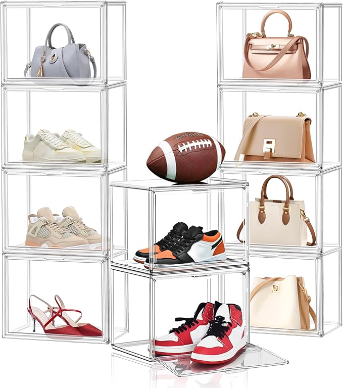 - Large Capacity:The clear shoe boxes with large capacity (14.1”x 8.9”x 10.5”) which can storage various types of shoes fiting up to US size 12.Many types of shoes such as heels, flats, sneakers, flip flops, sandals and boots are welcomed in these shoe containers.Because of the characteristics of transparency,you can easily store and find the shoes you want