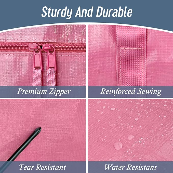 12 Pack Extra Heavy Duty Large Moving Bags with Strong Zipper & Comfortable Handles, Sturdy & Durable Clothes Storage Bags Totes Bins, Packing Moving Boxes for College Supplies, Pink