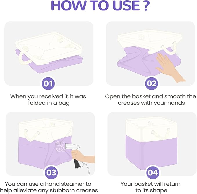12 x 12 Inch Cube Storage Bins, 4 Pack Fabric Storage Basket with Handles, Foldable Boxes Organizer for Shelf Baskets for Home, Clothes (White/Purple)