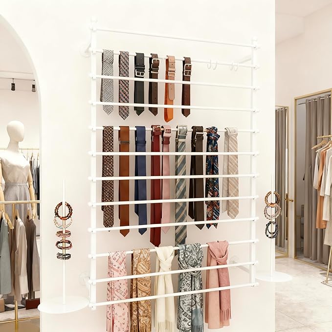 - 【Function】Multi-layer hanging rod design of the scarf display stand can be used to store display ribbon, scarf, ties, gift wrapping paper, spool, cloth fabric, belts, towel, shawls, silk scarves ect, to keep them in order and not easy to fold. Suitable for home cloakrooms, boutique retail stores, flower shop, studio, walk-in closets, shopping malls and commercial places.