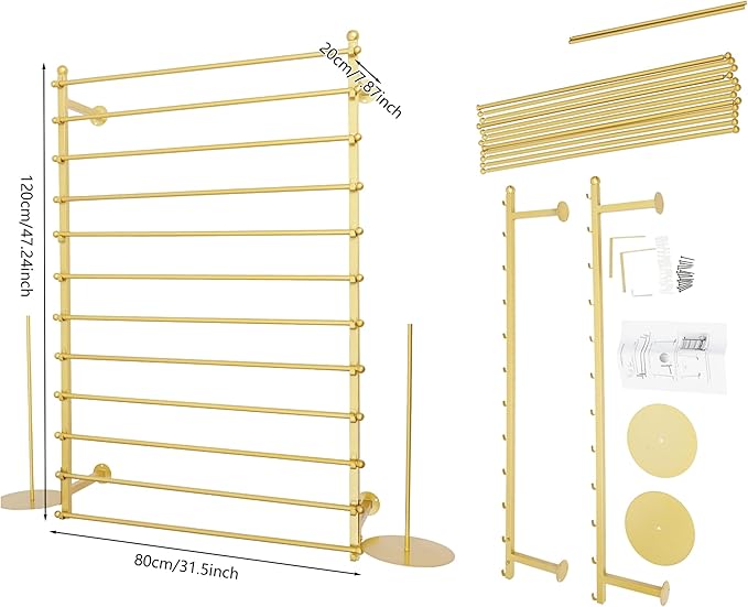 - 【Material Size】Multipurpose display rack, thickened support iron pipe, sturdy wear-resistant, strong load-bearing capacity up to 50Ibs, not easy to deform. High temperature paint, no fading, no rust, Smooth and easy to clean. Size: 80*20*120cm/31.5*7.87*47.24in. Distance from the wall is 20cm/7.87in. 12-layer hanging rod and 2 scroll rack on 2 sides, large capacity.