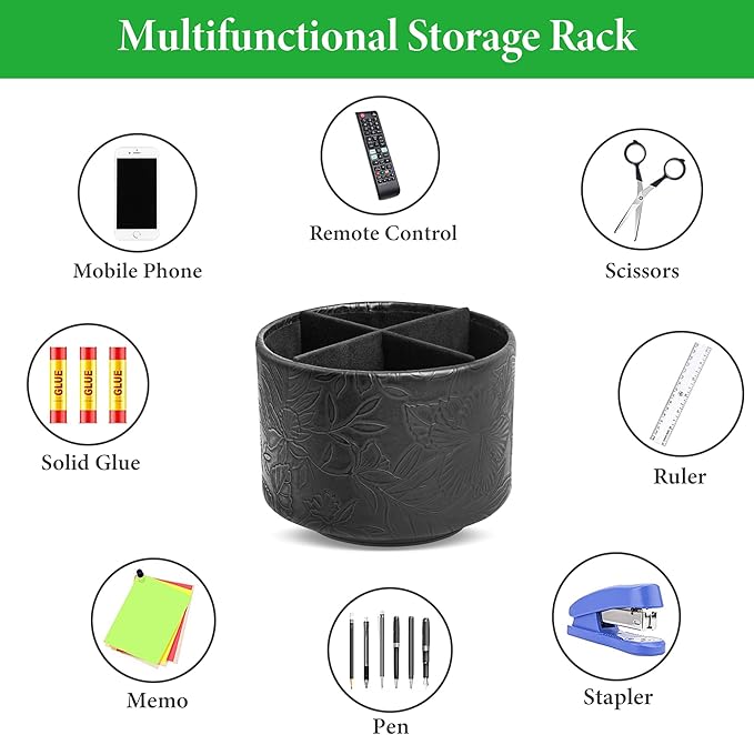 Hennaja Round Leather Art Supply Organizer,Remote Control Holder,360 Degree Spinning,Multi-Functional Pencil Holder,4 Compartments Desktop Stationary Organizer(1-Carved Black)
