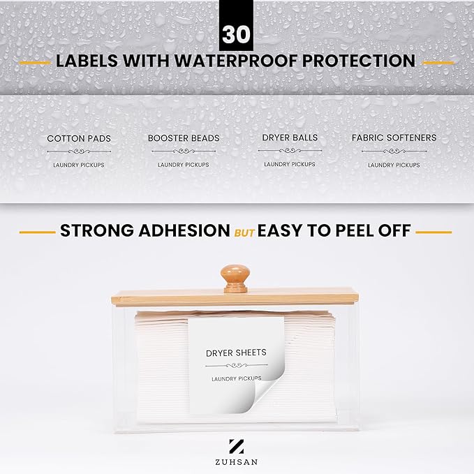 Dryer Sheet Holder with 30 waterproof Labels, Acrylic made tissue box holder with black bamboo lid, Acrylic Container Storage Box for Laundry Room Organization, Holds Sheets, Balls (Black)