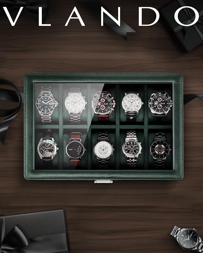 Vlando Watch Box for 10 slot, Lockable Watch Case with Textured Leather, 2 Layer Watch Holder for Rings, Bracelets, Glasses, Glass Lid, Removable Divider, Gift for Fathers, Husband, Friend, Dark Green
