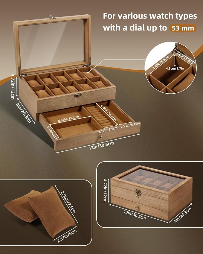Uten 10-Slot Watch Box, 2-Layers Solid Wood Watch Display Case with Glass Lid, Watch Holder Organizer with Soft Pillow and Velvet Lining, Watch and Jewelry Storage Box, Brown