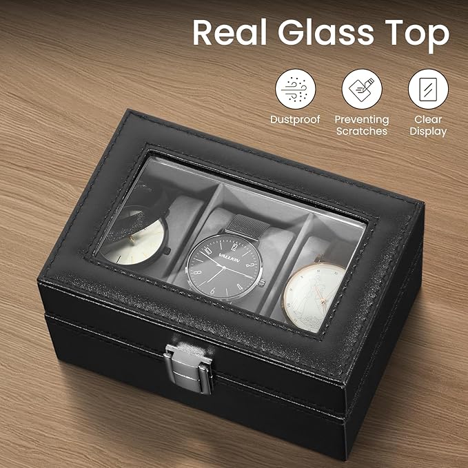 - Clear Glass Lid: This watch display case is perfect for displaying your watch collection, preventing your watches from getting dusty. The transparent top means that your solar powered watch will stay charged while in the watch storage box.