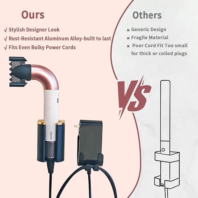 - 【Separate Cord Hook for Hassle-Free Storage — Keep Cables Tidy & Accessible】This dyson airwrap holder comes with a detachable cord hook, perfect for organizing curling iron cords, flat iron wires, or Dyson Airwrap cables. The separate cord hook prevents tangling and supports heavy-duty cords, keeping your curling iron setup neat and accessible—ideal for creating a clutter-free styling area