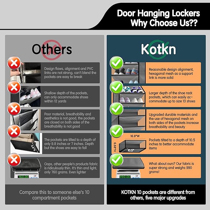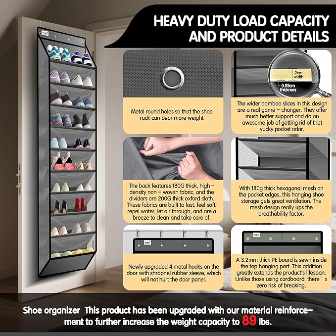 - đăEFFORTLESS ACCESS WITH 10.5" DEEP SLANTED POCKETSăOur over-the-door shoe organizer features deep slanted pockets (50% deeper than standard) for easy shoe removal, even from tight spaces. The open-top design + breathable mesh sides enhance airflow to prevent odor and make items visible at a glance. Reinforced 200D fabric ensures no sagging or stretching, even when holding 2 pairs of size 12 athletic shoes or tall boots â perfect for closets, dorms, and busy households.