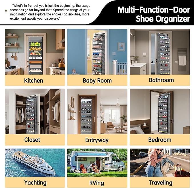 - âăMEET YOUR MULTIPLE NEEDS & IDEAL GIFTăOur multi-functional over-the-door shoe organizer comes with 4 heavy-duty metal hooks, you can hang it on different doors to maximize the vertical space for shoe storage, besides placing your shoes you can also use it for your daily cleaning supplies, hairdressing supplies, hats, scarves, gloves, toys, toilet paper, water bottles and more. Place the right items according to your needs. Explore more ways to use it.