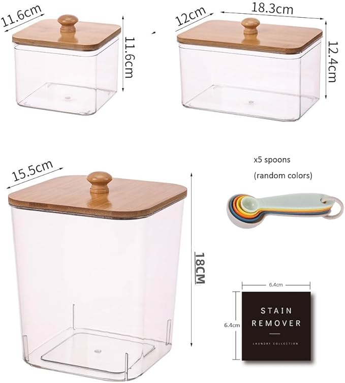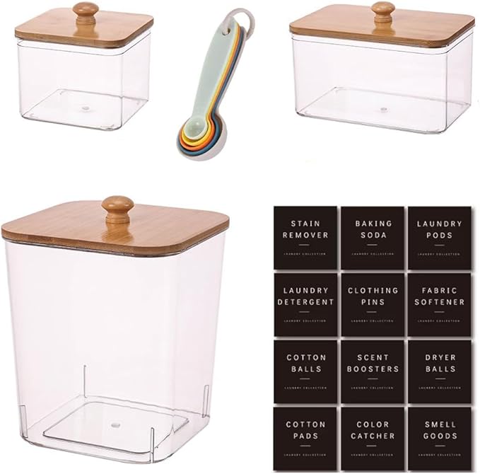 - COMPLETE SET: Includes 3 large storage containers with secure-fitting lids and adhesive labels for organized laundry room storage