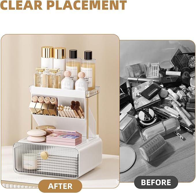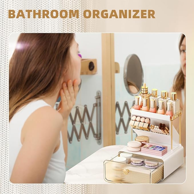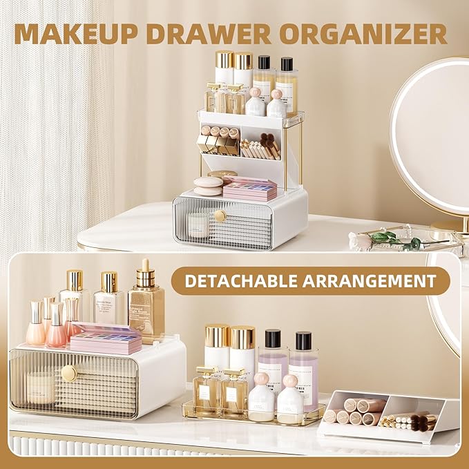 - 1. Multi-Purpose Makeup Organizer Countertop & Vanity Organizer – This versatile storage box is perfect for organizing makeup on your vanity, skincare in the bathroom, or stationery on your desk. The spacious design with smooth-gliding drawers and built-in holders keeps everything tidy. Use it as a bathroom countertop organizer, desk organizer with drawers, or perfume organizer for a clutter-free space
