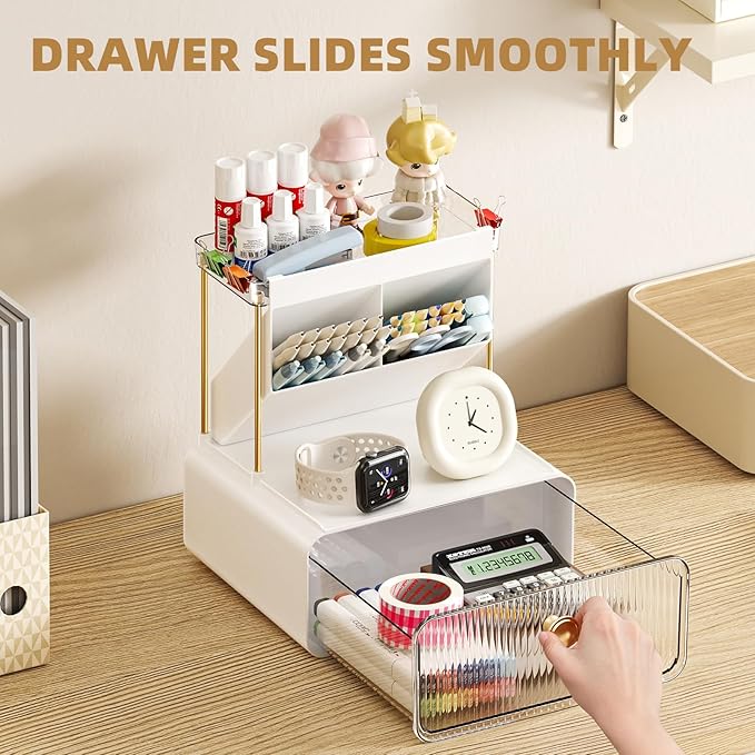 - 5. Versatile Drawer Storage with Secure Hold – The spacious drawers with anti-tip design keep items secure. Whether storing cosmetics, skincare, or office supplies, this desk organizer with drawers ensures everything stays within reach. Upgrade your bathroom countertop organizer or workspace today