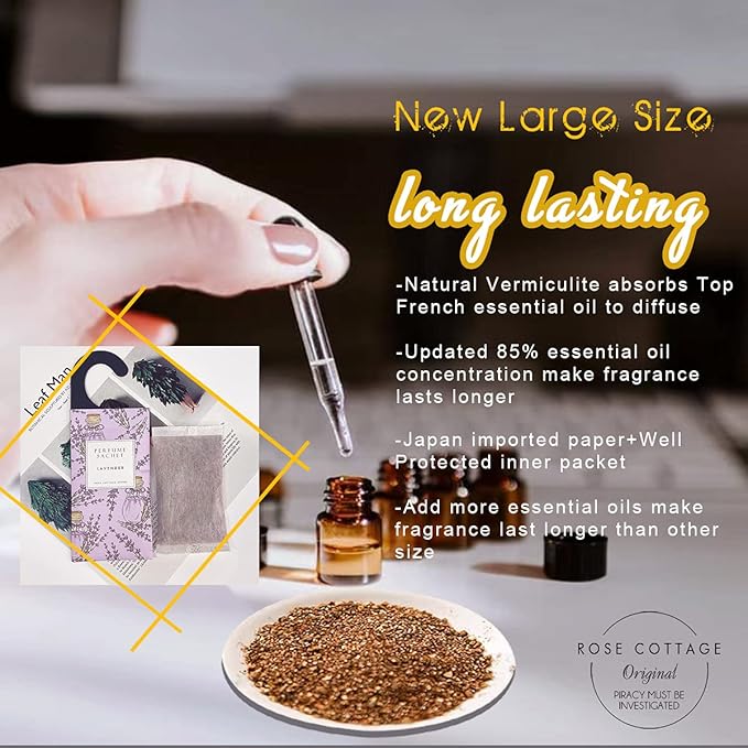 - [Safe Material Made Every Breath Have A Guarantee]Made of top Essential oil created by french professional perfumers.You must haven't smell such unique pure and fresh fragrance .This large size sachets add more essential oils than the small size,making room fresheners dissipates well while lasts longer.You can absolutely trust that they are also great as shoe odor eliminator and trash can deodorizer, keeping your every breath fresh and safe!