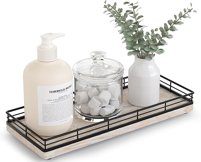 Bathroom Tray for Counter Top Organizer – Ash Wood Vanity Tray with Metal Frame for Dresser, Kitchen, Nightstand – Black & Whitewashed Decorative Storage
