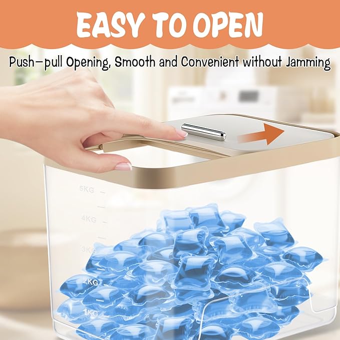 - Slide-Top Lid: The laundry pod holder features a sliding lid that makes it easy to access and refill detergent pods. The laundry pods container will help protect contents from dust and moisture while keeping them within easy reach. The sliding cover is simple and smooth, and it won't get stuck like other types of covers